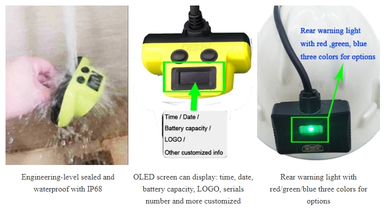 Mining Lamp Features1. IP68 water-proof 2. Rubber coating process 3. Impact-resistant 4. Anti-explosive 5. An OLED screen with more information display 6. Panasonic high-capacity battery 7. Strong engineering plastic 8. RGB rear warning light | Applications: